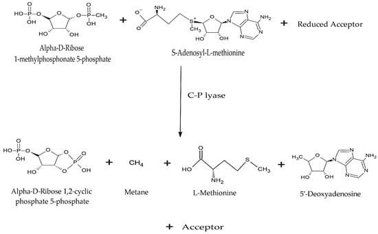 The enzymes and proteins of C–P lyases are complex and specific to their substrates. In Escherichia coli, they are all encoded by the 14-cistron operon (Phn CDEFGHIJKLMNOP), which is activated under conditions of phosphate deficit allowing the use of phosphonates [102]. Figure 6 shows the reaction of a C–P lyase.