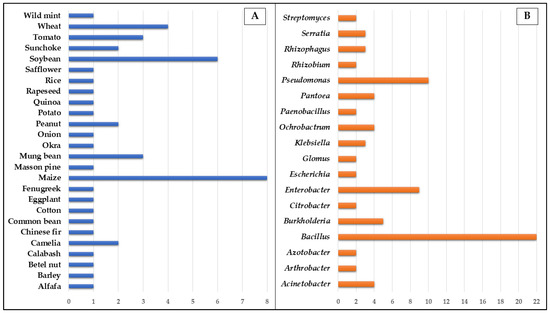 There is also great diversity in PSM. Bacteria have several representatives of the genera Azospirillum, Bacillus, Pseudomonas, Nitrosomonas, Erwinia, Serratia, Rhizobium, Xanthomonas, Enterobacter, and Pantoea [12,63]. Among the non-mycorrhizal fungi are the genera Penicillium, Fusarium, Aspergillus, Alternaria, Helminthosporium, Arthrobotrys, and Trichoderma, [62,65]. Examples of mycorrhizal fungi are Rhizophagus irregularis, Glomus mossea, G. fasciculatum, and Entrophospora colombiana [28,66].