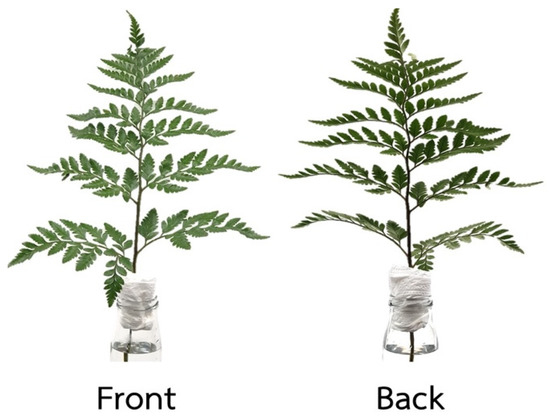 Leaves of Davallia solida (G. Forst.) Sw. were harvested in the morning, washed and delivered to a flower market. Leaves at the commercial stage with no spores (25 cm × 40 cm) as shown in Figure 1 were obtained from Pak Klong Talad (flower market), Bangkok, and transported to the laboratory at King Mongkut’s University of Technology Thonburi (KMUT) within 2 h. After arrival at the laboratory, those showing fresh greenish leaves, of the same size and without any defect were selected, then re-cut under water to 12 cm leaf petiole length and placed in buckets with distilled water.