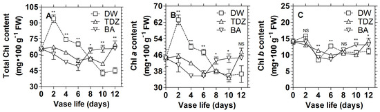 Effect of CKs on the contents of total Chl (A), Chl a (B) and Chl b (C) in D. solida leaves. Leaves were pulsed with distilled water (DW; control), 10 µM TDZ, 100 ppm BA for 24 h, then transferred to distilled water in a controlled environment room for the vase period. Asterisks above the curves at each time point represent significant differences between treatments according to Duncan’s multiple range test (DMRT); p < 0.01 (**) and p < 0.05 (*), NS not significant.