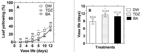 The yellowing ranged between 4 and 9% in the control leaves and those treated with TDZ on the initial day after storage, and increased continuously to 73 and 63% leaf yellowing, respectively, on day 12 of the vase period (Figure 9A). Treatment with TDZ pulsing prior to storage significantly delayed leaf yellowing during days 6–8, then extended the vase life of leaves to 9.1 days, longer than the control leaves, which had 7.1 days of vase life (Figure 9B).