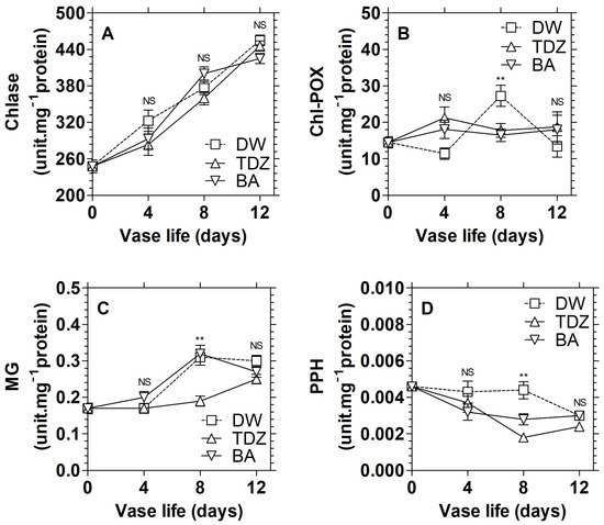 Effect of CKs on activities of chlorophyll catabolism enzymes; chlorophyllase; Chlase (A), chlorophyll peroxidase; Chl-POX (B), magnesium dechelatase; MG (C) and pheophytinese; and PPH (D) in D. solida leaves. Leaves were pulsed with distilled water (DW; control), 10 µM TDZ, 100 ppm BA for 24 h, then transferred to distilled water in a controlled environment room for the vase period. Asterisks above the curves at each time point represent significant differences between treatments according to Duncan’s multiple range test (DMRT); p < 0.01 (**) and NS not significant.