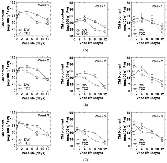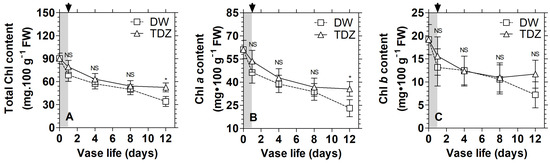 The contents of total Chl, Chl a and Chl b at zero time (before storage) ranged between approximately 70.38, 47.72 and 14.73 mg·100 g−1 FW, respectively, and tended to decrease during the vase period (Figure 8A–C). The control leaves had lower contents of total Chl and Chl a to 38.17 and 25.87 mg·100 g−1 FW on day 12 of vase life, while the leaves pulsed with TDZ maintained total Chl and Chl a contents at 49.48 and 33.53 mg·100 g−1 FW, respectively. However, no significant difference was observed in Chl b content between the control leaves and those treated with TDZ.