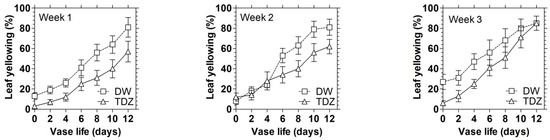 Leaf yellowing after one-, two- and three-week storage ranged between approximately 8, 10 and 16%, respectively, and then continuously rose throughout the vase period (Figure 6). On day 12, the yellowing of the leaves was 69, 71 and 85%, respectively. The result revealed that cut leaves stored for one week had a lower percentage of leaf yellowing than the two- and three-week storage; and that pulsing treatment with TDZ significantly delayed the yellowing of leaves to 57% after one-week storage, while that of the control and TDZ treatment groups were 85% after three-week storage.