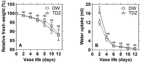 The relative fresh weight of leaves and water uptake had a similar trend of decline after one week of storage (Figure 7A,B). The leaves of D. solida showed a gradual decrease in relative fresh weight throughout the vase period. Moreover, on the initial day after storage, the water uptake of leaves pulsed with TDZ was the highest at 16.96 mL, while that of control fronds had 12.20 mL, then rapidly decreased over the vase period. No significant difference was observed in the fresh weight and water uptake between the control leaves and those treated with TDZ.