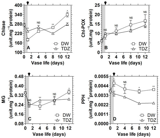 Effect of TDZ and MAP on activities of Chl catabolism enzymes; chlorophyllase; Chlase (A), chlorophyll peroxidase; Chl-POX (B), magnesium dechelatase; MG (C) and pheophytinese; PPH (D) in D. solida leaves after 1-week storage. Leaves were pulsed with 10 µM TDZ and distilled water (DW; control), then packed in BOPP bag, and stored at 10 °C under cool-white fluorescent lights for 12 h/d for 1 week. After storage, ferns were transferred to distilled water in a controlled environment room for the vase period. Asterisks (*) indicate significant differences between the two treatments after storage (t-test; * p < 0.05, ** p < 0.01, ns not significant). The black arrow indicates the initial day in the vase.