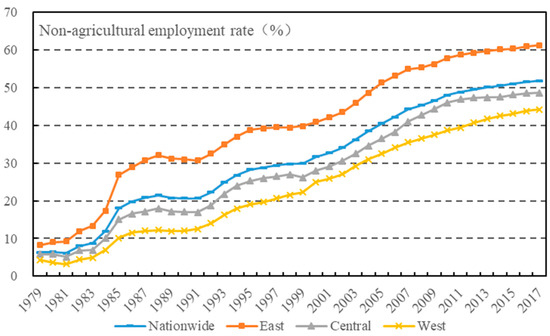 The rural labor force can be allocated between industries and regions to promote the development of industrialization and urbanization in China. Figure 2 shows the basic situation of rural–urban mobility of the rural labor force in China since 1979. With the continuous increase in labor demand in the industrial sector, the rising wages have induced millions of migrant workers to urban areas. At the national level, the total non-agricultural employment increased from 19.5 million to 275.8 million. The non-agricultural rate of the rural labor force reached 51.82% in 2017. From 1979 to 2005, with the relaxation of population mobility policies and the establishment of the market economy system, the non-agricultural employment scale of the rural labor force has shown an accelerating trend, while there has been a labor shortage along the coastal areas in China after 2006. Although the wages of migrant workers have accelerated since then, the growth rate of the non-agricultural employment rate of the rural labor force has slowed down, which means that the potential of the labor force in rural areas has begun to decline with the decreases in adjustment effect of labor factors on agricultural production.