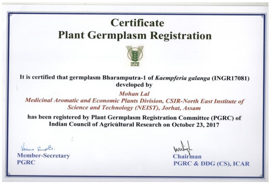 According to the Eberhart and Russell (1966) model, a genotype is said to be stable if it has a mean greater than the population mean, βi~1 and σ2di~0 [32,33]. The mean values of Bharamputra-1 for all the traits were higher than the population mean and the control varieties except dry rhizome recovery, essential oil yield and days to maturity. From the present study, it can be interpreted that in few cases the lower mean values than the population mean is also a desirable factor. The variety Bharamputra-1 showed the mean values of 10.01 tonnes/ha, βi = 1.13 and σ2di = −0.07 for rhizome yield. In contrast Rajani and Kasthuri depicted mean value (5.41 and 5.42 tonnes/ha), regression coefficient (1.15 and 0.73) and deviation of regression (−0.07 and −0.07) for rhizome yield making it less desirable than the identified line for selection of this particular trait. Similarly, a significant βi for the trait, days to maturity in the control varieties makes it unstable in nature. This increases the favorability of Bharamputra-1 compared to the control varieties based on its consistent performance. Additionally, the rhizome yield, essential oil yield and dry rhizome recovery for Bharamputra-1 showed βi equal to 1.13, 0.76 and 0.92, respectively, and σ2di equal to −0.07, 0.00 and 0.04, respectively, indicating high stable nature. The varieties Rajani and Kasthuri showed significant βi > 1 for days to maturity interpreting adaptability to unfavourable environment (Table 5). Singh et al. (2020) also reported that a βi significantly greater than the unity represents stability below the average, and a βi significantly lower than unity denote stability above the average [34]. The essential oil yield wasfound to be better and more stable for the control varieties compared to the identified superior variety. Earlier, a variety named Jor Lab K-1 was released, which was rich in essential oil yield (2.38%) and was stable for four different locations of NE India [23]. The identified germplasm was registered by the Plant Germplasm Registration Committee (PGRC) of ICAR-NBPGR, New Delhi, vide registration number INGR17081 [35] (Figure 1).