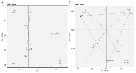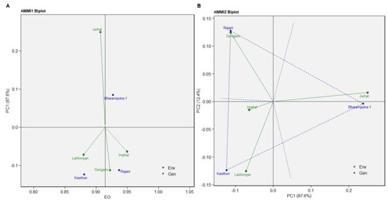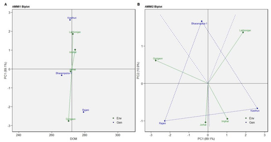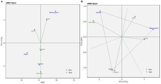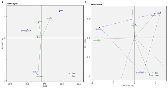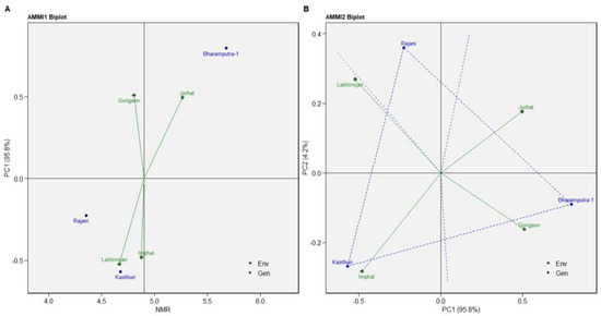 Again, for NMR, the Rajani and Kasthuri varieties were more stable than Bharamputra-1 (Figure 4A). The variety Kasthuri was best suitable for Imphal, Rajani variety for Lakhimijan, and Bharamputra-1 for Jorhat and Gorigaon, as revealed through AMMI2 biplot analysis of NMR (Figure 4B).