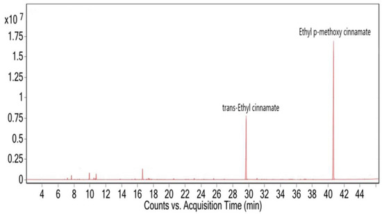 The GC/MS analysis of the essential oil extracted from Bharamputra-1 is presented in Table 7 and Figure 8. The analysis showed that the principal component identified were ethyl-p-methoxycinnamate (37.25%), trans-ethyl cinnamate (28.35%), endo-borneol (8.91%), eucalyptol (6.83%), (-)-camphor (3.98%) and 3-carene (3.77%). A total of thirty chemical constituents were identified, which accounted for 98.58% of the total essential oil composition (Table 7, Figure 8).