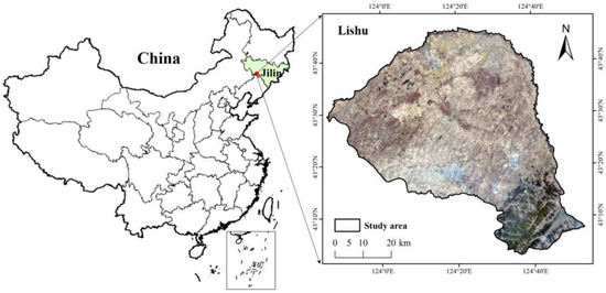 Lishu County (Figure 1), which is located in the western part of Jilin province, China, has a temperate humid and semi-humid monsoon climate with a low annual temperature, with plains in the north and hills in the southeast. Many soil types in this area, mainly including black soil, black calcium soil, light black calcium soil, and brown soil, belong to the typical thin black soil area of Northeast China [28]. The main land-cover types include cropland, forest, grassland, impervious surfaces, bare land, and water. This area has a large cropland, accounting for more than 80% of the county. It is a veritable central grain-producing area in this region and plays an irreplaceable role in ensuring China’s food security. Maize, rice, and soybean are the main crops, and deciduous trees are the main natural vegetation. The growth period of each crop is concentrated and different from that of natural vegetation, which is suitable for extracting information from croplands using multi-seasonal data. Since 2007, the national government has established a research demonstration area in Lishu County in conjunction with various scientific research institutes and put forward a black soil protection project named the Lishu Model, which is committed to protecting the sustainable development of black soil. The complex spatial heterogeneity of the region and frequent human activities lead to land cover changes in the area.