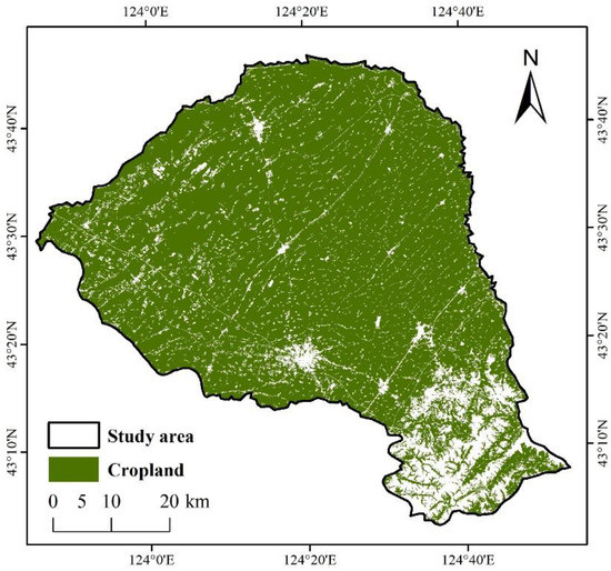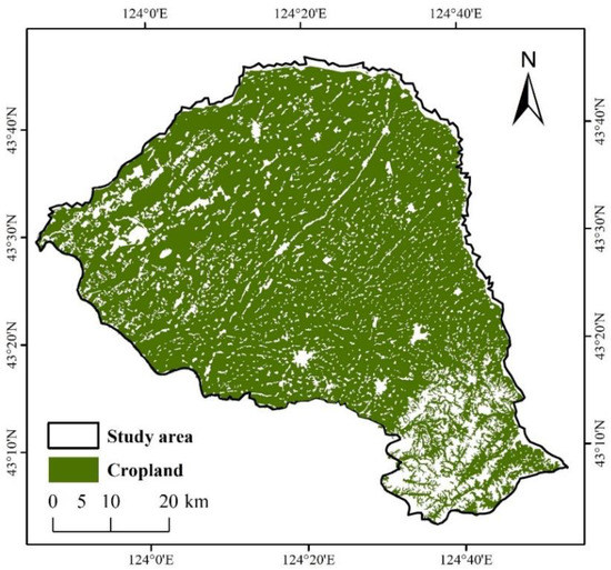 (2) Vector data of Lishu (2020). The vector data of cropland in Lishu County in 2020 were produced based on a human–computer interactive interpretation using the Landsat images from the Institute of Geographic Sciences and Natural Resources Research, Chinese Academy of Sciences, with a mapping scale of 1:100,000 and including 6 classes and 25 subclasses [29]. Standard quality control and integration checking for each dataset were implemented using many field survey photographs and records during the same period to ensure high-quality and consistent interpretation. Therefore, the vector data are the most reliable and comparable data available in the area during the same period, and the data had been widely applied to estimate the accuracies of different classification results [30,31]. The vector data (Figure 3) were used as the main reference data for the accuracy evaluation of information extraction.