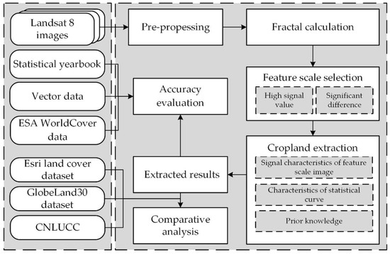 Figure 5 shows the flowchart of the information extraction method developed in this study. Firstly, data preprocessing was achieved, and fractal processing of the multi-seasonal images was used to select the feature-scale image of cropland. Secondly, cropland information was extracted using the degree of separation between cropland and other land-cover types in the statistical curve of the feature-scale image. An accuracy evaluation of the information extraction results was conducted using overlay analysis. Thirdly, through the comparison with other products, especially the local comparative analysis, the advantages and disadvantages of the method were summarized.