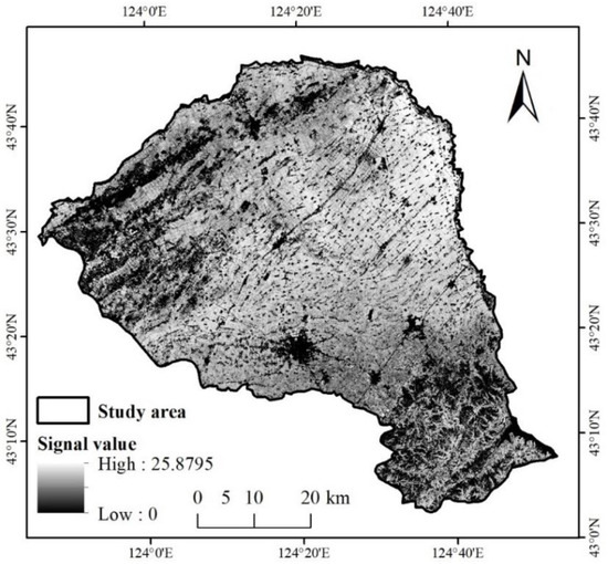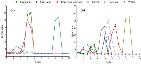 The fractal signal images and the fractal signal variation curves were combined for a comprehensive evaluation to select feature scales of different targets. The scale with a high signal value of the land-cover type and a significant difference from other land-cover types is the feature scale of this land-cover type.