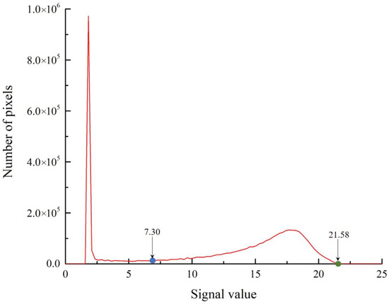 According to Figure 6b and the feature-scale image in Figure 7, the fractal signal values of cropland and other land-cover types differ and have an obvious separation. Figure 6b shows that the signal value of cropland is concentrated around 20, while those of other land-cover types are concentrated around 2. However, the result of Figure 6b was calculated based on the sampling sites and only represents the approximate range of signal values of each land-cover type. Therefore, we plotted a statistical curve of the fractal signal values of all pixels at the feature scale, which reflects the relationship between the fractal signal value and the number of pixels, as shown in Figure 8. As the signal value increases, the number of pixels shows the characteristics of sharp increase, sharp decrease, slow increase, and slight decrease, and finally tends to be smooth. Specifically, the number of pixels reaches the highest value at a signal value of 2 and decreases sharply to a trough at a signal value of 7.30 (blue point in Figure 8). Then, the number of pixels starts to increase slowly with an increase in the signal value and reaches a peak at a signal value of 17.68, which is generally consistent with the result obtained for cropland, as shown in Figure 6b. Finally, the number of pixels begins to decrease slowly. After the signal value of 21.58 (green point in Figure 8), the number of pixels begins to smooth again. Combined with the actual spatial distribution of cropland in the remote sensing image, we determined that the signal segmentation threshold of cropland is from 7.30 to 21.58 in the feature-scale image, and we extracted the spatial distribution of cropland, as shown in Figure 9.