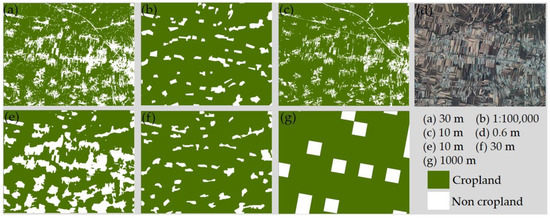 Although the proposed method achieved satisfactory results, further improvement can be conducted from three aspects. The first one is the spatial resolution of the remote sensing images used. The Landsat 8 OLI data with a resolution of 30 m might have led to additional uncertainty in this study. High-resolution data, such as GF-2 or WorldView-3, should be integrated for the information extraction of cropland. Secondly, the inconsistency of land use and land cover nomenclature for different remote sensing data products might have affected the accuracy assessment of cropland extraction. Thirdly, although the main reference data were obtained using the vector data with a scale of 1:100,000 and the ESA WorldCover data at a 10 m resolution, systematic validations at different scales and regions should be employed to enhance the suitability of the method developed in this study for future implementation. In addition, the relation of the feature scale with a number of sampling sites results in poor comparability for different remote sensing images that have originated from different phases or sensors.