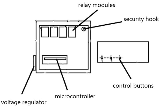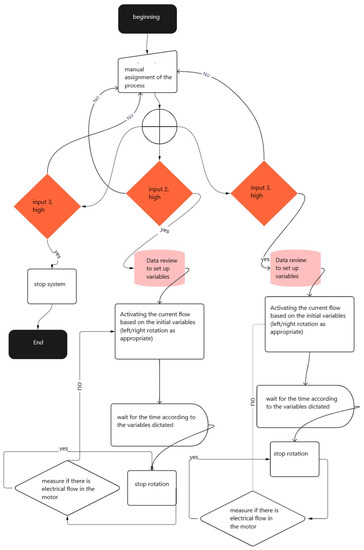 As shown in Figure 6, four relay modules are used which work together with a microcontroller with five analog input/outputs and 14 digital inputs/outputs, of which four analog outputs and 10 digital inputs/outputs are used with the ability to activate internal resistors. Four of the analog outputs will be connected to the relays; three analog outputs will be connected to three pushbuttons; three analog outputs will be the return of the pushbuttons; and the digital input will be responsible for measuring feedback; all of this powered by a 5-volt output voltage regulator to avoid damaging the controller in addition to the use of 12–24 voltage regulators at the motor’s current input.