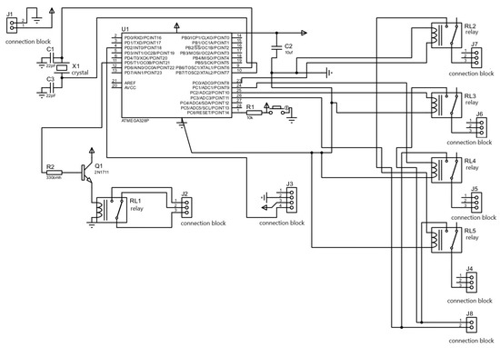 The microcontroller works in conjunction with a 16 MHz quartz oscillator in parallel with two 22 picofarad capacitors. The microcontroller receives information from the buttons and activates the relays to start the cycle. It is recommended to place a diode at the input of each relay to prevent voltage spikes towards the microcontroller.