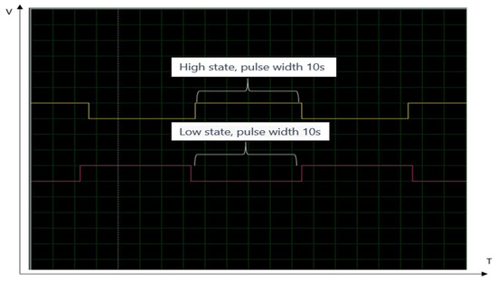 A diagram of the operation of the “Automatic Equipment” rotation system is shown in Figure 7. This process starts by sending 5 v pulses to the base of the transistors. This pulse sending is segmented into two stages in which in each of these stages two analog outputs send a 5-volt signal with a pulse width of 10 s and a frequency of 0.05 Hz. In the same way, the second stage emits the same pulses but with the difference that this last one is phased out with respect to the first by 10 s in such a way that the first pulse is in a high state and the second in a low state (Figure 8), and in this way the passage of current in two directions is controlled.