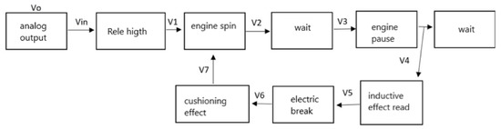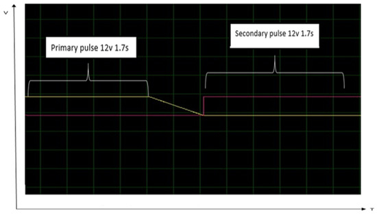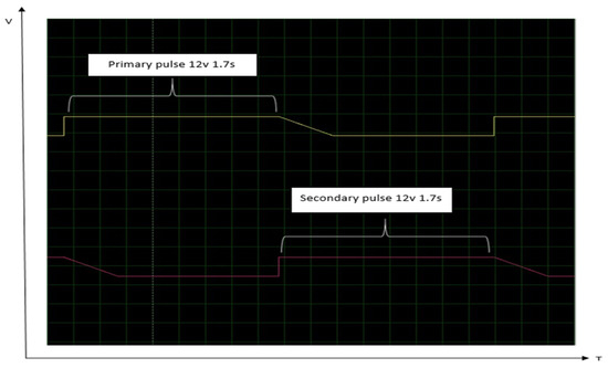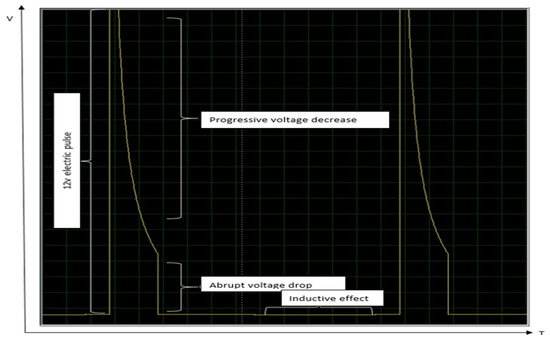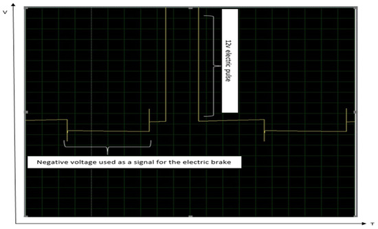 The electric pulse used to determine the activation of the electric brake is generated during the time interval between two pulses when deactivating the current for the change in rotation, taking advantage of the inductive effect of the motor’s coils which, for a brief period of time, functions as a generator, which we take advantage of as a signal, as shown in Figure 9.