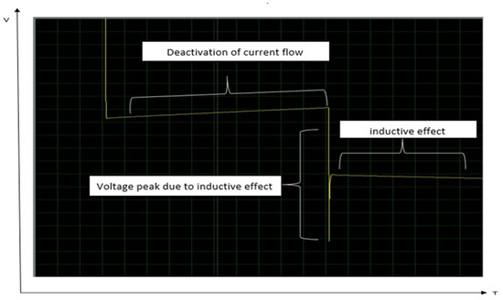 As seen in Figure 10, the peak voltage is relatively low, approximately −2-volt as a peak at disconnection and −1-volt for a period of 3 s before experiencing another peak of tension at the connection of approximately 2.2-volt, all due to inductive loads.