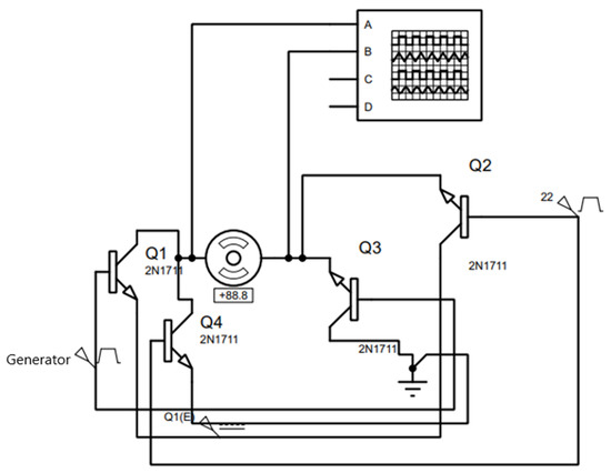 Figure 14. Diagram of the part of the circuit responsible for avoiding short circuits in the lines, (generator and 22 are pulses generated and sent by the microcontroller while Q1(E) is the voltage source). - Four 2N2222 transistors, which function as switches to activate the relays.