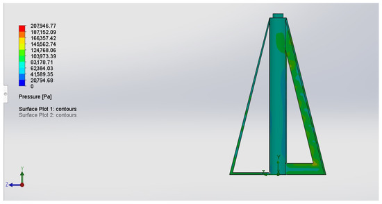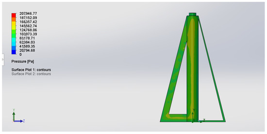 The results of the fluid analysis on the blade structure indicate that the blades suffer resistance forces that range from a minimum of 20,794.68 Pa to a maximum of 187,251.09 Pa, as can be seen in Figure 17 and Figure 18. The software used for this study is SolidWorks Flow Simulation 2020.