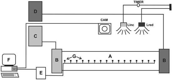 Experimental set-up for the recording of thermoregulatory behaviour [18]. A—thermal gradient chamber; B—fluid chambers; C—cryostat; D—thermostat; E—recording keeper; F—computer; G—thermocouples; Linc—white light; Lred—red light; CAM—video camera.