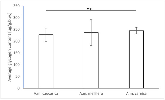 Differences between the average glycogen contents (in μg/g.b.w.) in the organisms of bees from the following subspecies: Caucasian honeybee, Carniolan honeybee and Central European honeybee. Statistical significance was determined (** p < 0.01;).