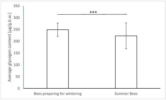 Differences between the general average glycogen contents (in μg/g.b.w.) in bee organisms depending on the sampling season. Statistical significance was determined *** p < 0.001).