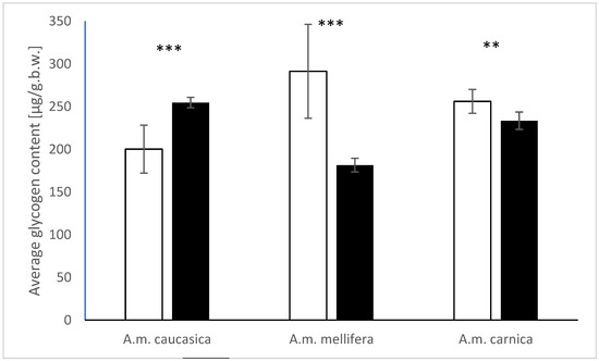 Mean glycogen content (in μg/g.b.w.) in the organisms of worker bees of the subspecies studied in autumn (white bars) and spring (black bars). Statistical significance was determined (** p < 0.01; *** p < 0.001).