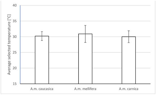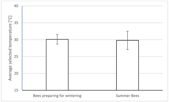 Figure 5 illustrates the influence of subspecies affiliation on the choice of ambient temperature by the honeybee workers. Since the differences in the selected ambient temperature between the tested subspecies reached a maximum of 1 °C (Caucasian honeybee 30.2 ± 1.43 °C; Central European honeybee 30.9 ± 2.73 °C; Carniolan honeybee 30.0 ± 1.90 °C), we did not find any statistically significant effect of subspecies affiliation on the choice of ambient temperature (F(2,28) = 0.32; p < 0.7314). Additionally, in the case of the season, although the temperature chosen by autumn bees preparing for wintering (31.0 ± 1.60 °C) was slightly higher than that for summer bees (29.8 ± 2.27 °C), there were no statistically significant differences (F(1,28) = 2.15, p < 0.15) (see Figure 6).