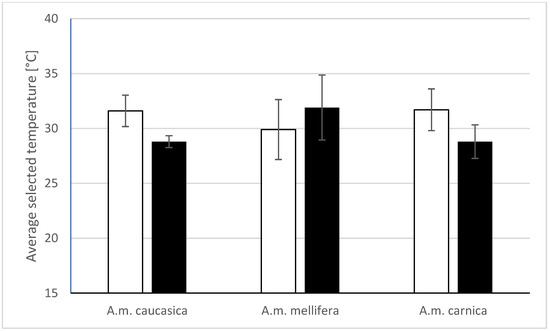 Average ambient temperature [°C] selected by worker bees of the studied subspecies born in autumn (white bars) and spring (black bars).