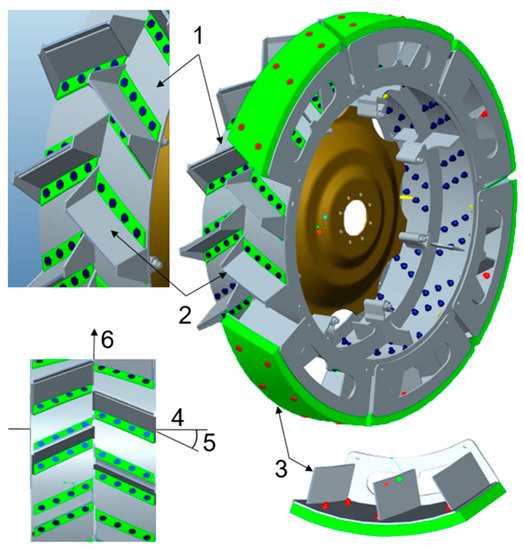 Lugged-type rigid wheels have some advantages over tire wheels for traction intensification on loose deformable terrains. Many forms of lugged wheels are in use in agriculture, especially in low-land farming and paddy fields, on conventional tractors and boat-type tractors that have limited applicability in some specific conditions [9]. Some new types of moveable lugged wheels and transformable walking wheels were developed for ground vehicles that are specific to small machines and not applicable to conventional agricultural tractors [10,11]. To further enhance the applicability and advantage of lug-type rigid wheels, it is required to improve their structure and design characteristics, with a special focus on agricultural field conditions.