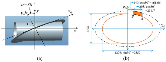 In the “” coordinate system, the small ellipse at the lug base of the iron wheel (as shown in Figure 2b) corresponds to the following equation: