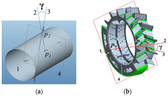 As shown in Figure 3a,b, line 1: iron wheel axis; plane 4: is a plane perpendicular to line 1 wheel axis; point p1: is the intersection of plane 4 and line 1 wheel axis; point p2: is the intersection of plane 4 and smaller elliptic curve; line 2: the intersection of point p1 and point p2. line 3: intersect line 2 at point p2 and go along the wheel lug surface and plane 4; angle gamma (γ): mounting angle of iron wheel lug faceplate; that is the angle between line 2 and line 3 at vertex point p2.