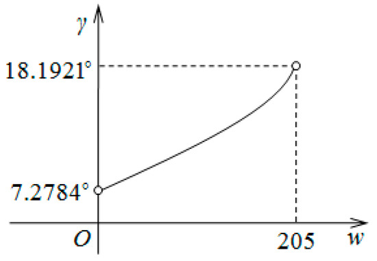 According to Equation (8), the relationship curve between the installation angle of the lug and the width “w” along the axis of the wheel can be drawn, as shown in Figure 4.