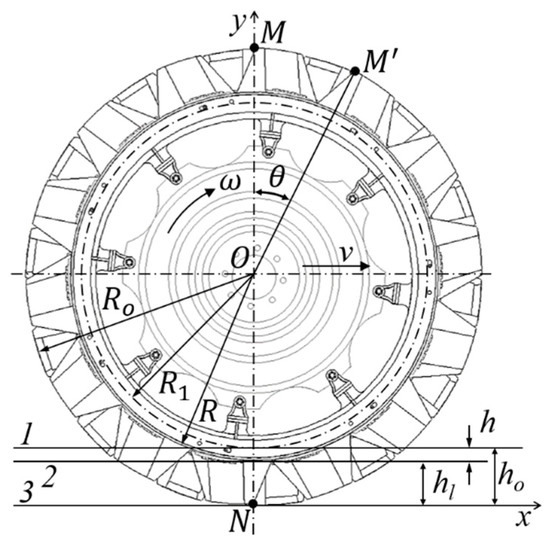 Figure 5 shows that the actual rolling motion of the driving wheel is in accordance with plan 3. The velocity is the theoretical velocity of the point “O”, and “” is the maximum rolling radius, with “” as the angular velocity. Equation (9) can be used to calculate the theoretical velocity.