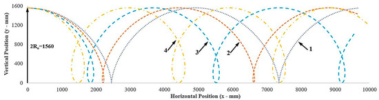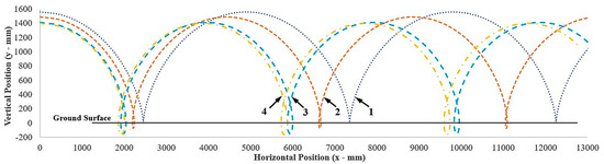 From the above equations, it is found that the motion trajectory of point is associated with the rolling radius of the rigid lugged wheel and the wheel travel reduction rate. The motion trails of point with different travel reduction rates are shown in Figure 6, and with different lug penetration or wheel submergence in Figure 7. The vertical axis (y-axis) represents the vertical position of the point, and the horizontal axis (x-axis) represents the horizontal position of the point at any instant of time while the wheel is rolling. The curves 1, 2, 3, and 4 in Figure 6 represent the trajectories of point with a travel reduction rate of 0.0, 0.1, 0.25, and 0.4, respectively. Curve 1 is the trajectory of a point with ideal motion without slip, which means no travel reduction, and this pattern of motion is called cycloidal motion. Curves 2, 3, and 4 show the reduction in horizontal distance traveled per rotation of the wheel to calculate the travel reduction rate. As the travel reduction rate increases due to slipping and shearing between the surfaces, it produces more soil breakage and damage and reduces the distance traveled. Curves 1, 2, 3, and 4 in Figure 7 represent the trajectories of point with lug penetration and wheel submergence of 0, 75, 150, and 165 mm, respectively. The effect of lug penetration and wheel submergence on rolling motion and horizontal distance traveled is obvious.