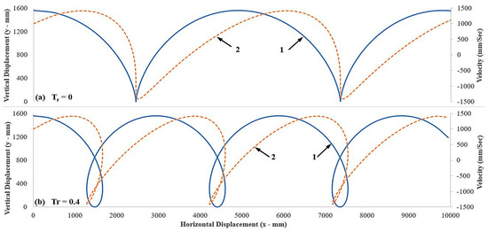 Relationships of vertical displacement and velocity of lug edge point M at different travel reduction rates (a) 0, and (b) 0.4, and corves 1 and 2, represent vertical displacement and velocity respectively.