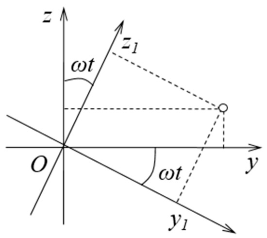 In the process of cultivation or tillage, the tractor’s forward speed is , along the positive direction of the y-axis. The angular speed of the iron wheel is ω, along the negative direction of the x-axis. Then, there is a rotation and translation transformation relationship between the coordinate system x1y1z1 fixed on the iron wheel at the time ‘t’ and the fixed coordinate system xyz at the beginning, and the rotation transformation relationship is shown in Figure 9.