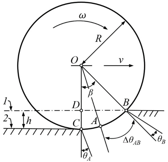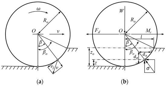 Most of the upland farming areas in China cultivated two crops a year, so farmers tilled the soil twice a year with rotary or vertical tillage implements. Considering the physical characteristics of farmland soil, we can characterize it as an isotropic and completely plastic material. This study assumes that the depth of surface soil compacted by the iron wheel due to submergence of the iron wheel rim of radius R = 638 mm during cultivation is h = 15 mm, as shown in Figure 10. According to this figure: