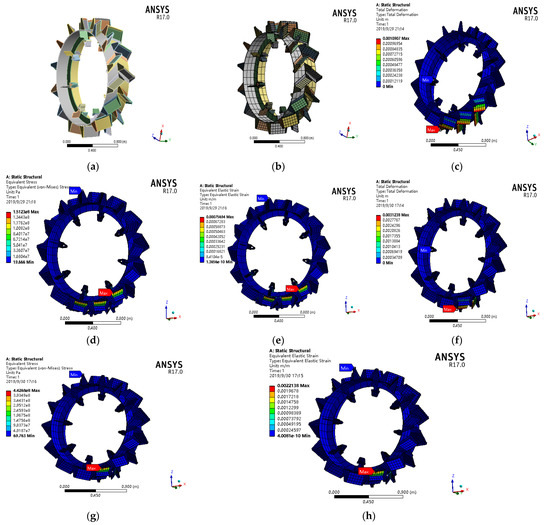 The structure of the rigid lugged wheel under static loads was analyzed for structural stability and optimization using ANSYS Workbench mechanical simulation software. ProE’s (Creo Elements) 2D and 3D engineering design platform was used to generate 3D wheel model geometry, and the entire wheel structure assembly was saved in “igs” file format, which is compatible with and importable into ANSYS Workbench. In ANSYS R17 Workbench, the static structural project solver was used for analysis, engineering data was modified according to test specifications and analysis requirements, and the ‘.igs’ geometry file was imported into the project schematic. After making some corrections and modifications, the final structure model was prepared, and the mesh was applied in Figure 12a,b. The meshing, loads, supports, and displacement setup were defined, and resulting behavior parameters, e.g., stress-strain and deformations were selected. The project was analyzed by the problem solver option in the design modeler of ANSYS. Results were generated in graphical form (color schematic), as presented in Figure 12c–h which explained the effect of applied loads on the wheel body.