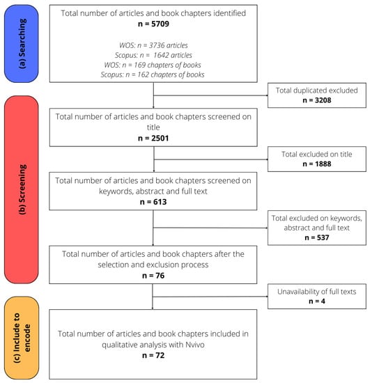 We initially captured a total of 5709 literatures. Then, we excluded duplicate posts (3208) and applied the eligibility criteria in the titles (1888), keywords (537), abstracts and in the full texts (537), respectively. The unavailability of the full texts made it possible to exclude four articles. Finally, we included a total of 72 articles and book chapters to codify and qualitatively analyze using the Nvivo Software (Figure 1). We denominated these stages as (b) “Screening” and (c) “Include to encode”.