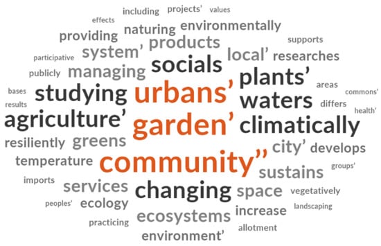 In the analysis of the full texts, the 50 most frequently used words are in Figure 3, with the words “garden”, “urbans” and “community” being the most counted. Those three words are followed by “waters”, “socials”, “changing”, “climatically”, “agriculture”, “plants” and “studying” to cover the podium of the first ten most frequently found words. In this case, a word frequency search was selected with the following characteristics: 50 most frequent words, with a minimum length of five letters (to avoid years), and grouping “with stemmed words”. The resulting key words confirmed that the content of the articles was in line with our research focus.