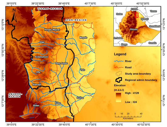 This research was conducted in Raya Valley, Southern Tigray, Ethiopia. Geographically, it is situated at 39°0′0′′ and 40°52′30′′ longitude easting and 12°7′30′′ and 13°12′0′′ latitude northing (Figure 1). The total land mass of the research area is about 14,532 km2. The altitude ranges from 324 to 4129 m above sea level (m.a.s.l). Rainfall is erratic and bimodal [36]. The mean annual rainfall of the research site reaches up to 558 mm [22]. Furthermore, the maximum and minimum temperatures were between 30.5 and 15.9 oC in 2015 [22]. The study area has various land cover types. Cultivated land and shrub/bushlands are the main land cover types that cover approximately 6232.3 (42.9%) and 3547.3 km2 (24.4%), while others cover 4752.5 km2 (32.7%). The total population of the study area was 1,200,136 (CSA, 2007) with 604,063 (50.3%) male and 596,073 (49.7%) female. The maximum and minimum family sizes of the study area are 6.4 and 4.2, respectively (Table 1). In addition, the total household of the study area is 272,295 for both male-headed and female-headed households (Table 1). The overall annual population growth rate during the periods of 1994 and 2007 was 2.6% per year [37]. After 2007, the population grew at an annual rate of 2.7%. Moreover, agriculture is the key economic activity in the area. The small-scale farmers in the area practice mixed farming systems such as crop production and animal rearing as a main source of livelihood. The livelihood zone in the area is largely classified as agro-pastoral, pastoral and cropping. According to the Raya Valley Livelihood Zone (2007), the dominant crops produced in the study area are sorghum, teff, and maize. Of all crops, sorghum is widely used as a staple food and is broadly grown under rain-fed agricultural practices, while teff is produced for both food and cash crop [22]. Cattle, goats, and sheep are extensively reared as a source of revenue and food. The farming activity largely depends on Belg (small rain) and Kiremt (Meher), the main rainy season.
