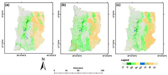 The LULCC data of Raya Valley were obtained from [22] for the period 1984, 1995 and 2015 to determine the proximate causes and underlying driving forces of LULCC in the area (Figure 2). The descriptions of each land use and land cover are presented in Table 3. The data indicated that there were significant changes in most of the land use and land cover types during the last three decades (Table 4). An increased annual change rate trend was observed in shrub/bush lands by 150.3 km2 (5.33%), grasslands 21.6 km2 (6.59%), built up area 8.8 km2 (9.19%), forestland 6.6 km2 (5.73%), barren land 2.5 km2 (0.15%), and water body 0.6 km2 (1.19%). However, the croplands and floodplain were decreased annually by 118.3 (1.95%) and 72.1 km2 (2.47%), respectively. Furthermore, during the period 1995–2015, the annual change rate of the shrub/bushlands was 46.4 km2 (1.0%), water body 0.6 km2 (1.0%), grasslands 17.9 km2 (3.2%), and floodplain 68.8 km2 (3.2%). Conversely, the croplands, forestlands, built–up areas, and barren lands were increased annually by 72.9 (1.5%), 2.8 (1.5%), 20 (10.4%), and 37.9 km2 (1.8%), respectively. Moreover, during the year 1984–2015, increases in croplands by 5 km2 (0.08%), forestland by 4.2 km2 (3.62%), shrub/bushland 23.4 km2 (0.83%), built–up area 16 km2 (16.76%), and barren lands 25.3 km2 (1.19%) were observed. In the same year, water bodies, grasslands, and floodplain area were declined annually by 0.1 (0.28%), 3.9 (1.19%), and 69.9 km2 (2.4%), respectively (Figure 2 and Table 4).