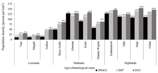 Population density is one of the most important underlying driving factors of LULCC in the clearing of forests for the expansion of agricultural land [13,54] and built up areas. On a global scale, deforestation has been linked to increases in population density and per capita consumption [10]. This may significantly affect the coverage of forests and grassland resulting from the reduction and abandonment of fallow systems [55] and the overall climate condition of the area. Studies have indicated that the population density of Ethiopia during the period of 1994 and 2007 was about 47.3 and 65.3 persons per km2, and this value increased to 99.0 persons per km2 in 2015. The changes in population densities during the second half of the 20th century clearly had an effect on land use and land cover, resulting in shrinking forests and grassland, expansion of cultivated areas, and intensified use resulting from reduction and almost complete abandonment of fallow systems [56]. Figure 3 shows that population density is increasing in the study area. In the years 1994(5), 2007, and 2015, the overall population density of the study area was about 65.3, 82.6, and 93.0 persons per km2, respectively. For example, the population density of the lowland area such as Yalo, Megale and Gulina during the period 1994 was less than 14.5 persons per km2; however, in 2015, the figure rose to 50.5 persons per km2 (Figure 3). Similarly, in the midland area, the 1995 population density was about 49.2; however, in 2015, the figure increased to 133.9 persons per km2. Furthermore, in the highlands area, the minimum density in 1995 was about 57.4; however, the value increased to 146.6 persons per km2 during the period 2015. In the study area, the population density was higher in the highlands area than in the lowlands and midlands. Therefore, an increase in population density may escalate the demand for land, as it is a major driving force of the LULCC in Ethiopia [55].
