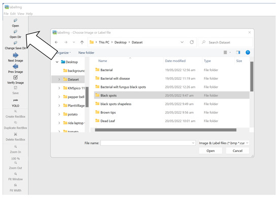 In this research step, the labelIMG tool, as shown in Figure 4, labeled the images. For tool installation, we used Python’s pip install labelIMG instruction to install labelIMG. After the installation of labelIMG, the process began with labeling the images. We made bounding boxes around regions of interest (ROI) in the labeling process.