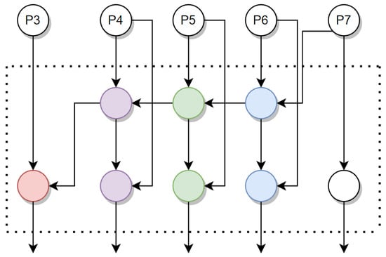 Google researchers recently unveiled Efficient Net, which is a convolutional network. The three sections are part of the object detector group known as EfficentDET. Efficient NET serves as the foundation of Google’s information collection process. However, it also recycles the milestones from ImageNet’s pre-trained network because it employs the same spacing scaling parameters as EfficientNet-B0 through B6. The bi-directional feature network serves as the feature chain for EfficentDET, as shown in Figure 7. BIFPN (bi-directional feature pyramid network) is used for quick and simple 2D feature engineering. The bi-directional feature pyramid uses scales ranging from levels 3 to 7, and the merging process is performed several times. The magnitude levels identify objects in the image that are of various sizes and densities. Image quality and size are directly related to the scaling factor. Consequently, p3 > p4 > p5 > p6 > p7 and p3 > p4 > p5 > p6 > p7 are used to indicate the resolution and quality of objects that were discovered. The bi-directional feature network is shown in Figure 7. The data flow direction of this method was bi-directional, as shown by the top-down and bottom-up approaches.